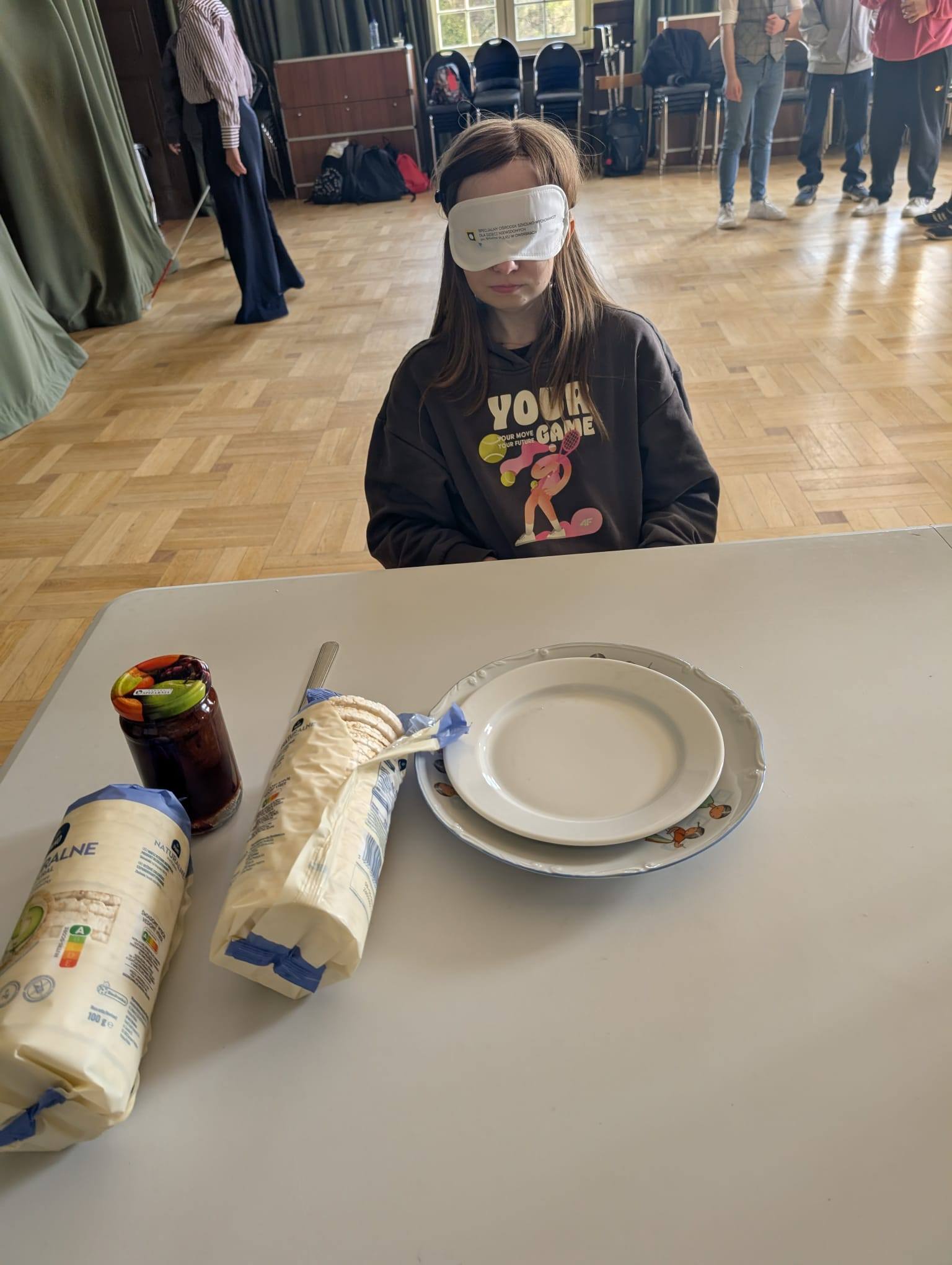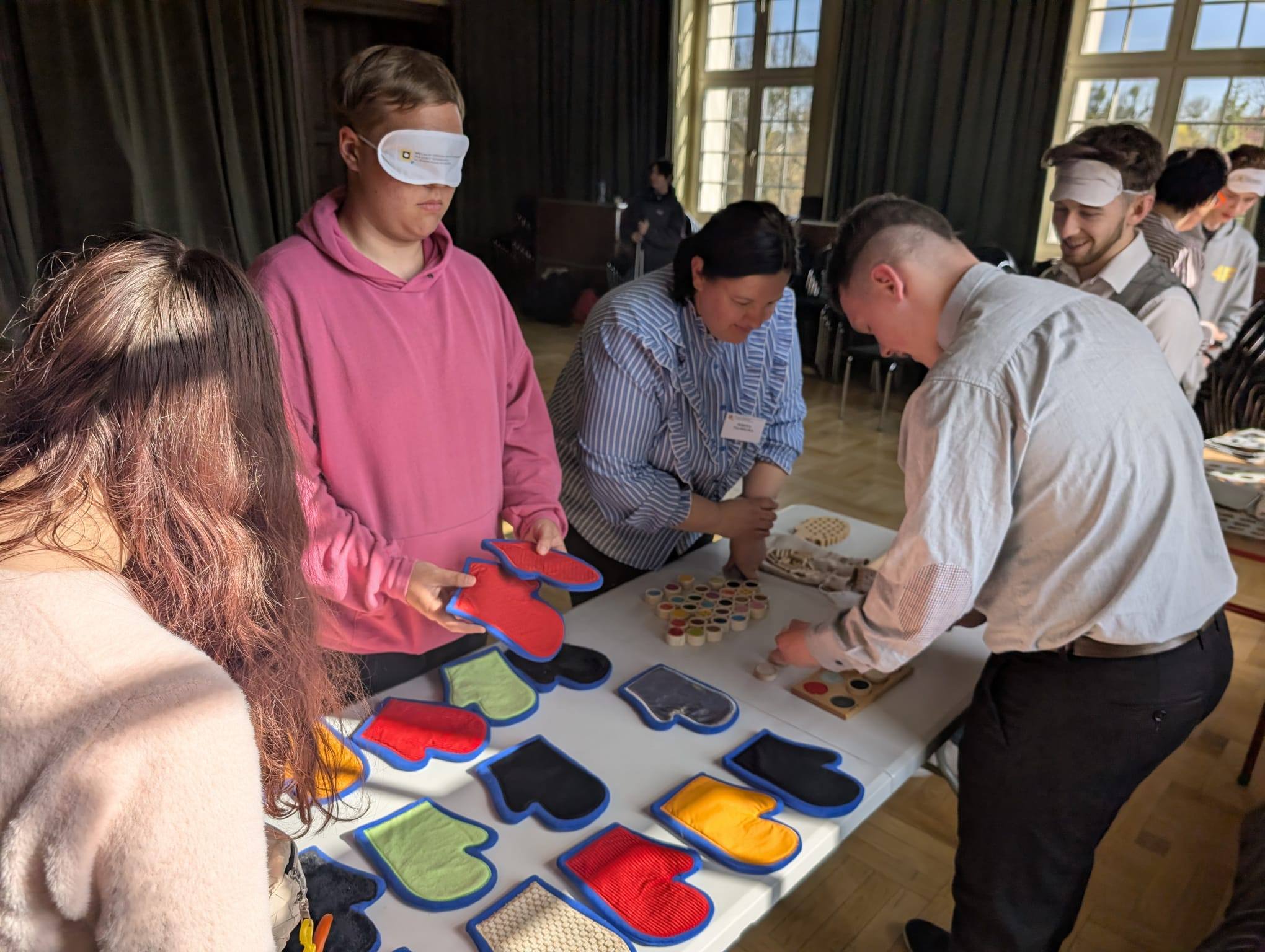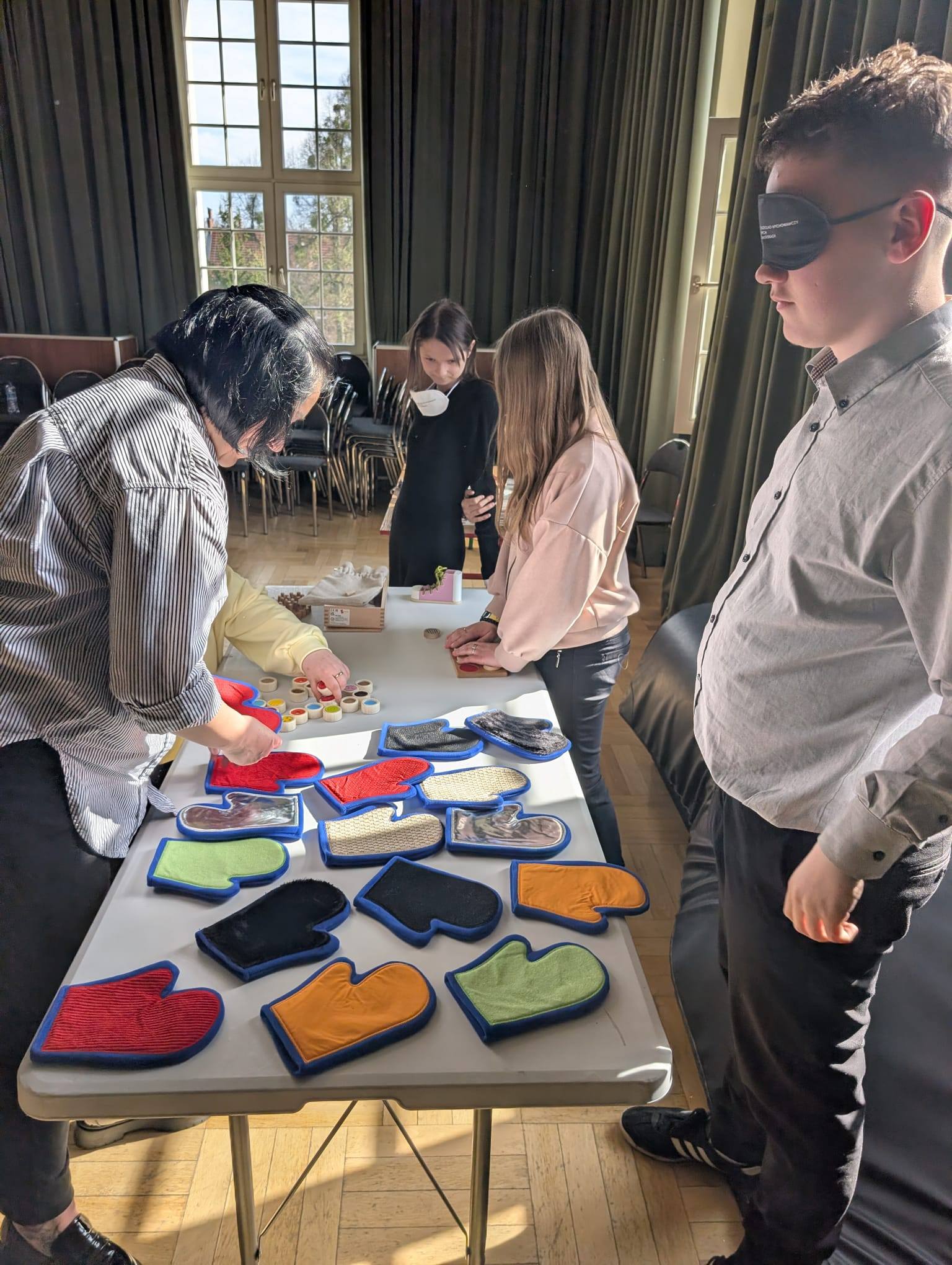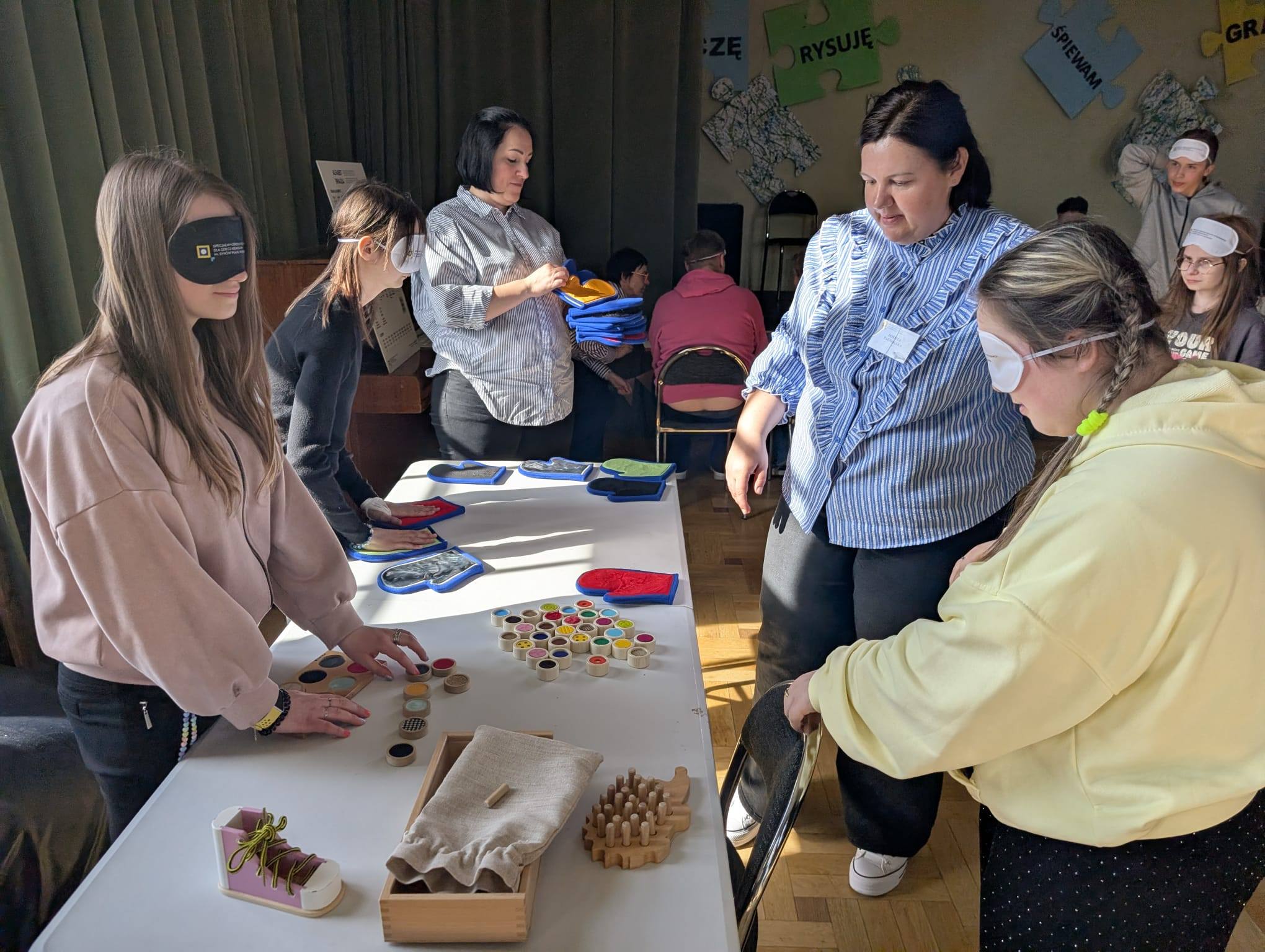 Uczniowie uczestniczyli także w warsztatach praktycznych, obejmujących m.in. naukę orientacji przestrzennej, podstawy pisma Braille’a oraz czynności dnia codziennego osób z dysfunkcją wzroku. Zdobyte doświadczenia były dla nich niezwykle cenne, rozwijające i inspirujące.